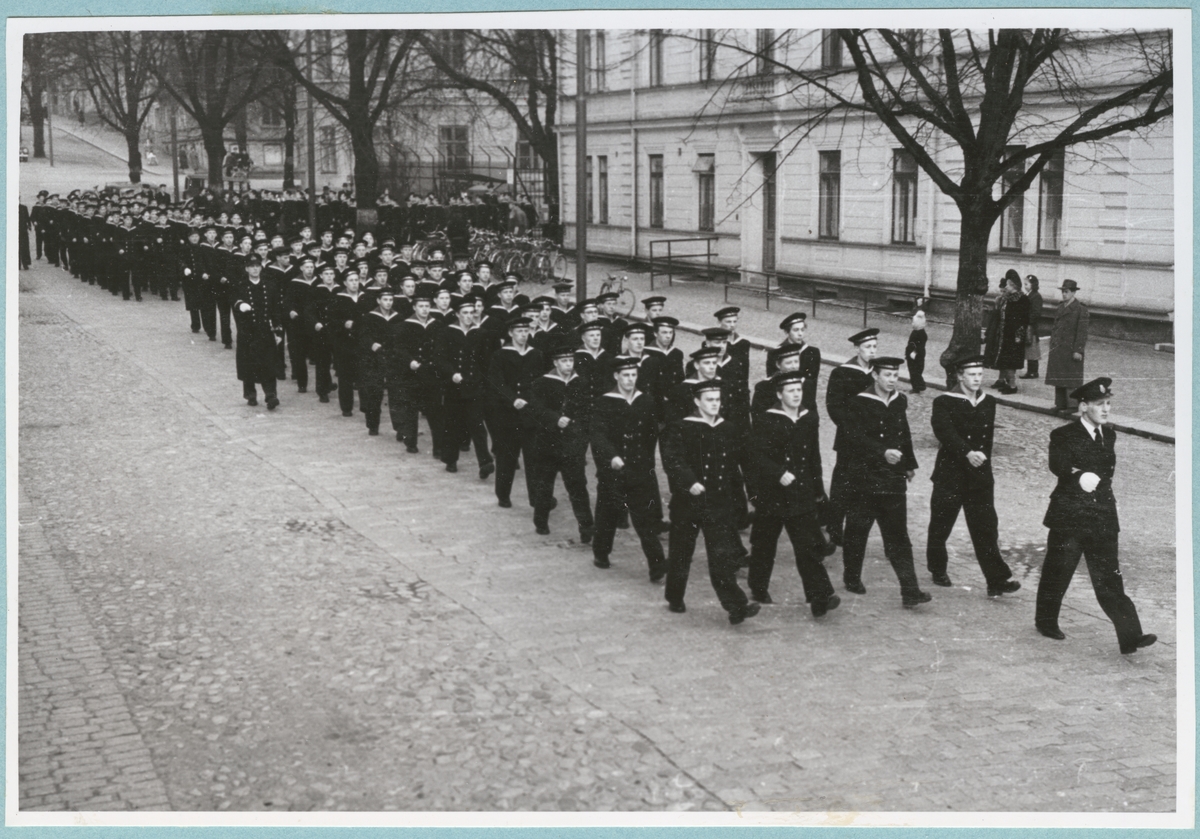 Kyrkparad för nyinryckta värnpliktiga. En grupp värnpliktiga flottister marcherar i trupp längs Drottninggatan. Vid sidan av står åskådare framför Bataljon Sparre.