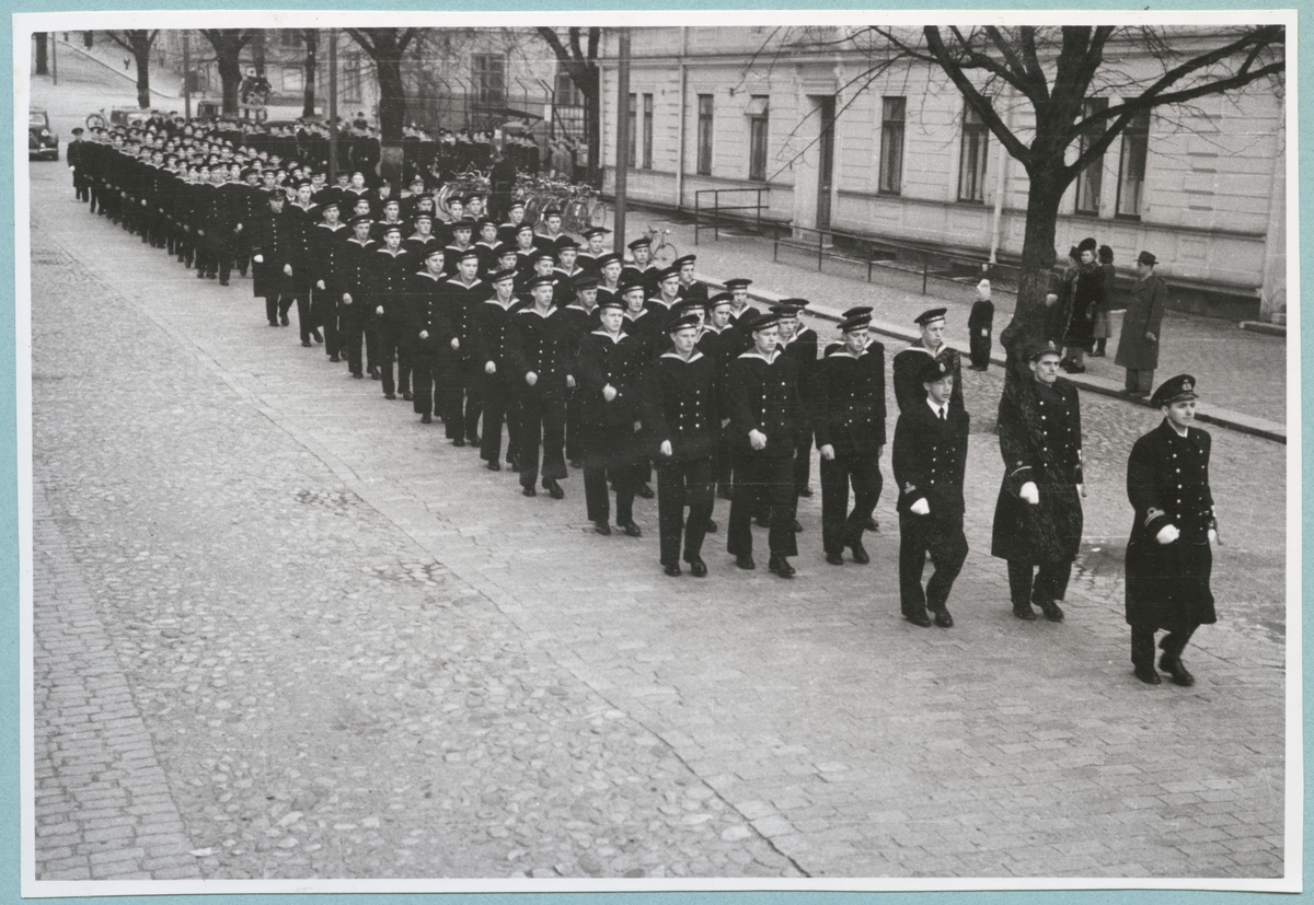 Uniformsklädda flottister marscherar längs med Drottninggatan under ledning av en löjtnant. Den stenlagda gatan kantas av bataljon Sparres kanslibyggnad. På gatan står även ett par civila åskådare.