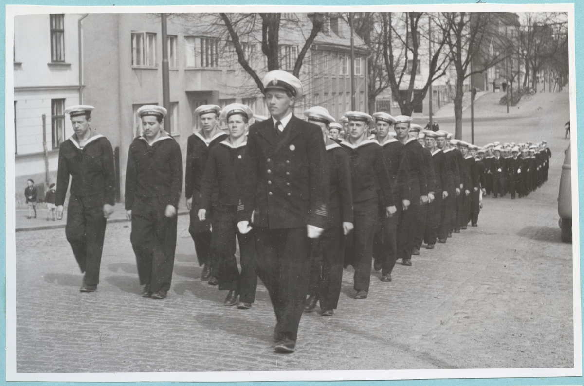 Uniformsklädda flottister marscherar längs med Drottninggatan. Den steglagda gatan kantas av träd och bebyggelse.
