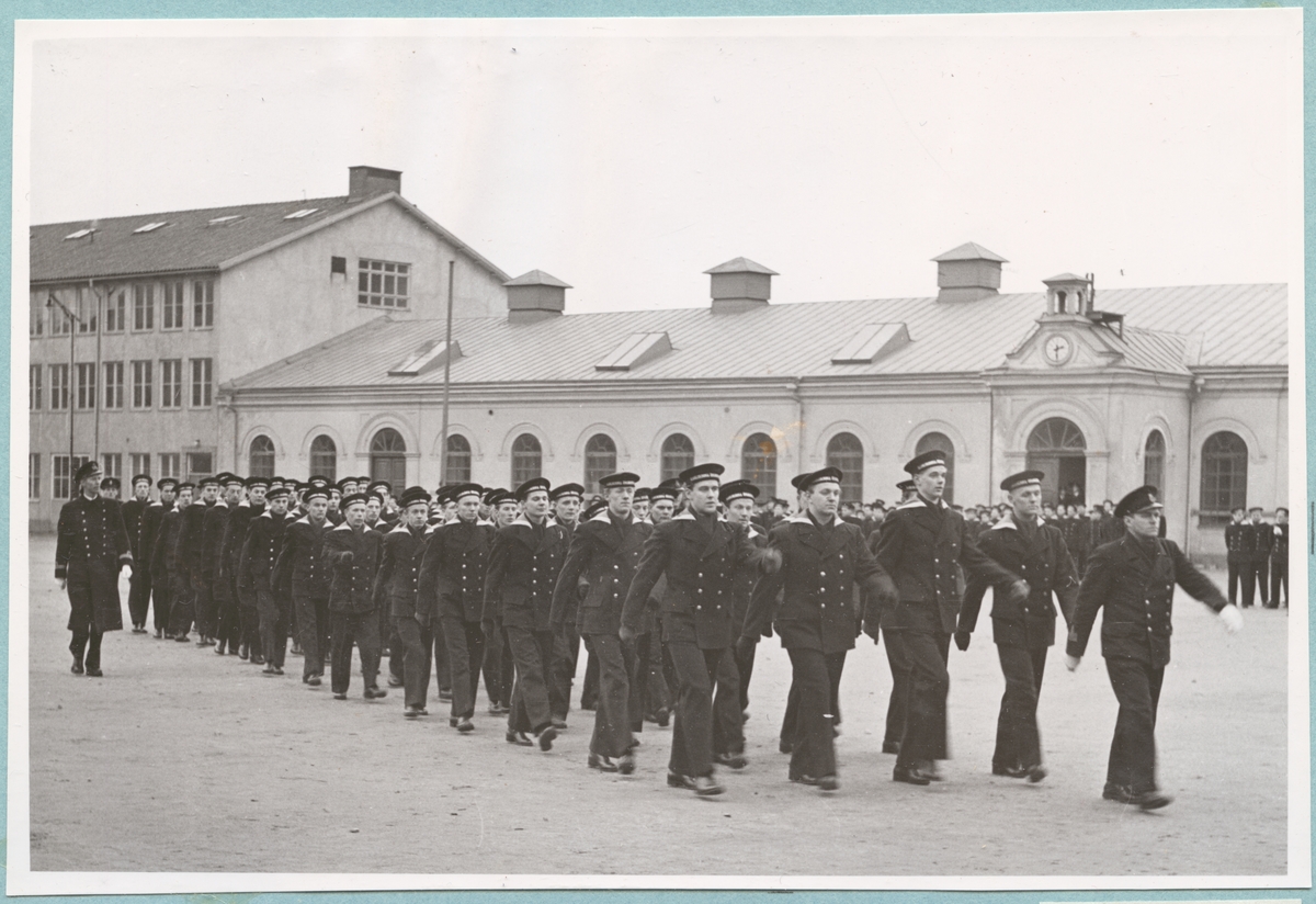 En grupp med flottister och militärer ur flottan marscherar över bataljon sparres kaserngård. I bakgrunden syns Sparres excercishus.
