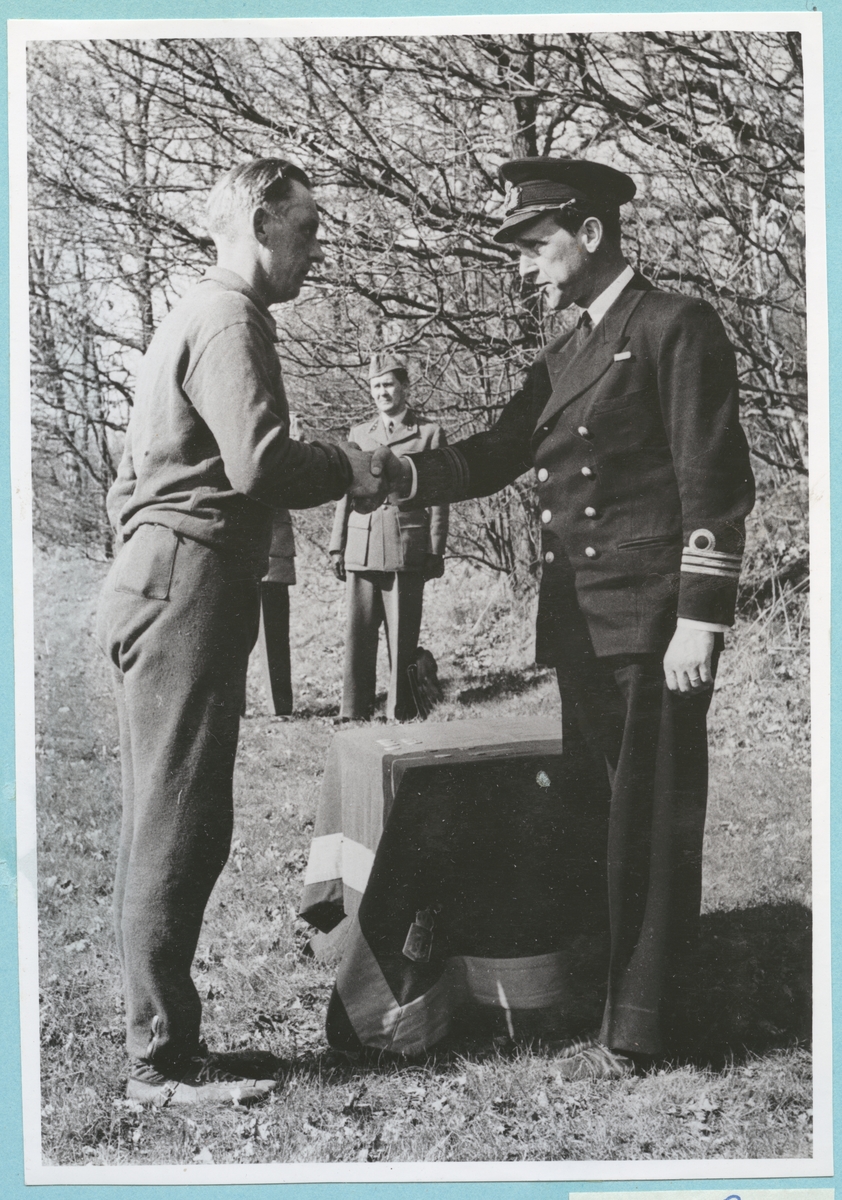 En idrottsklädd man tar en uniformsklädd kapten i handen. Bredvid dem står ett litet bord med en duk och medaljer på. I bakgrunden syns två militärer från armén.