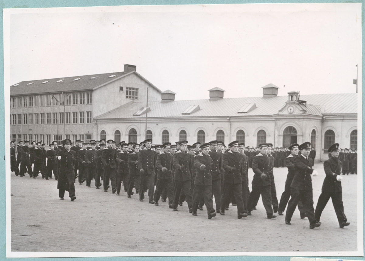 Uniformsklädda flottister marscherar över bataljon Sparres kaserngård. Längs med exercishusets putsade fasad med rundbågiga fönsteröppningar står grupper av uppställda flottister.