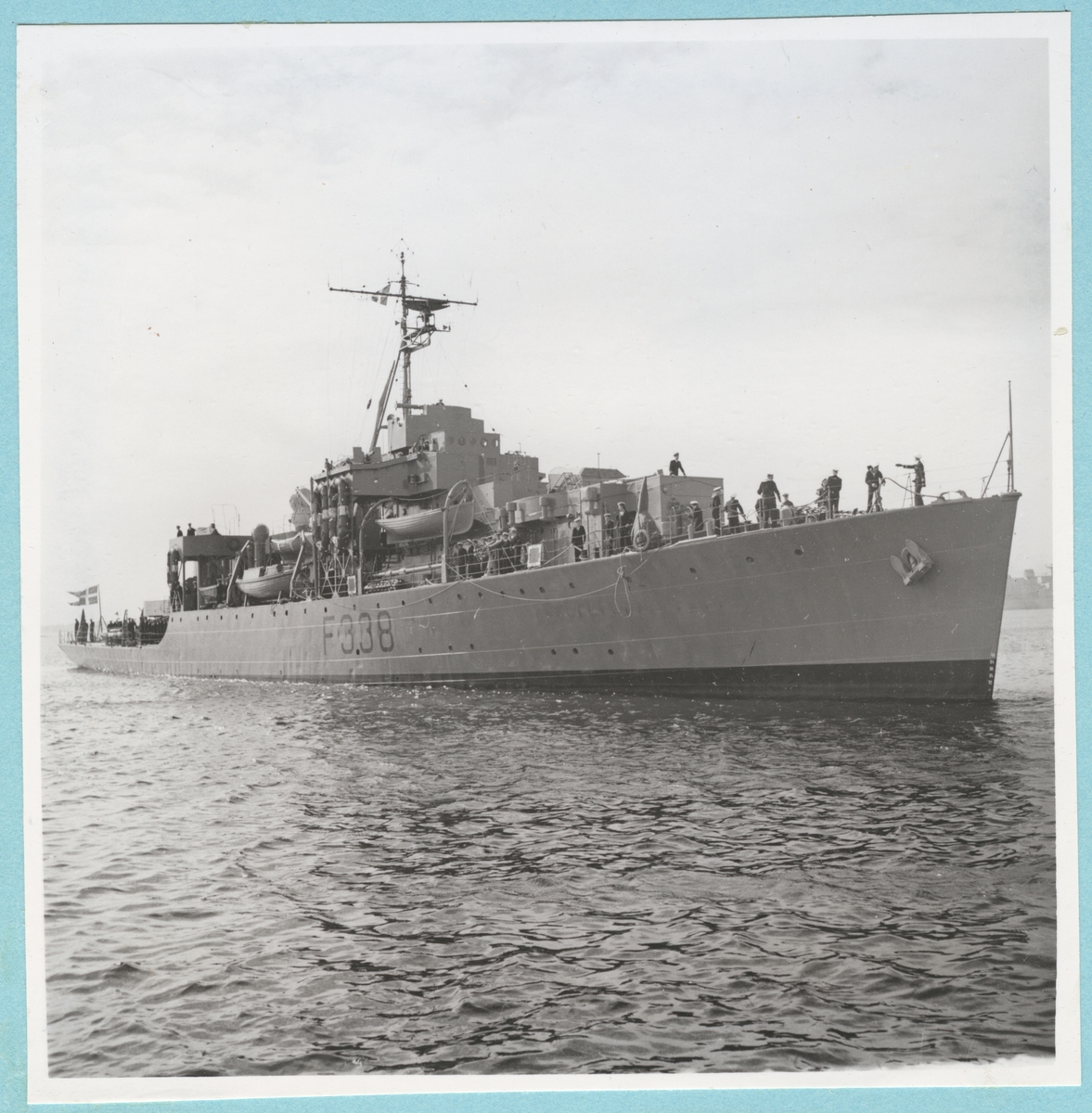 Den danska fregatten Holger Danskes (F338) styrbordsida när den åker in mot Karlskrona. Ombord syns besättningsmän. Från Danska och Norska örlogsbesöken den 29/6 - 4/7 1951.