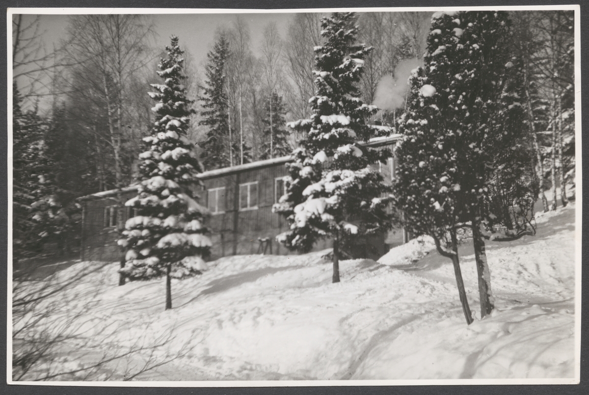 Titel: Fotografiet föreställer en barack under vintertid i en snötäckt skog.