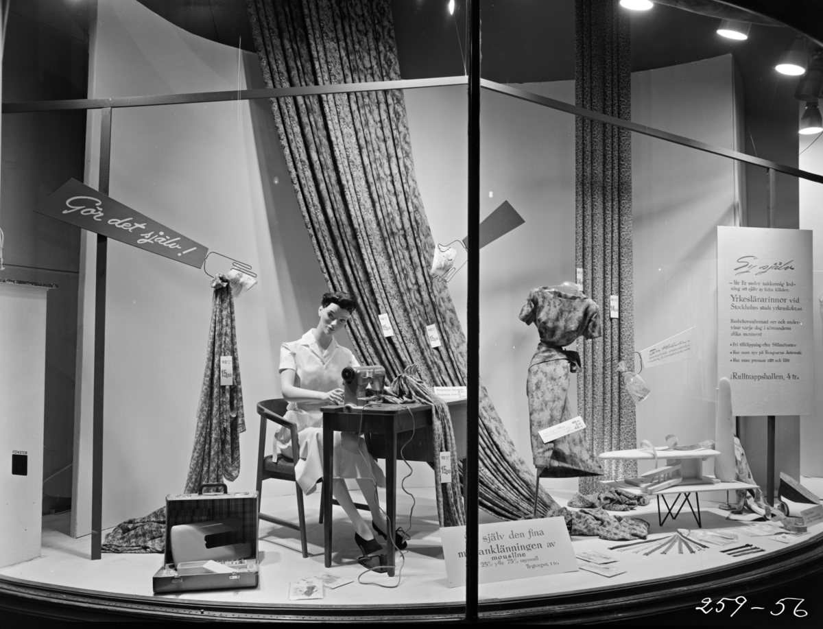 Skyltfönster på Nordiska Kompaniet. "Gör det själv" Yrkeslärarinnor lär ut sömnad på Nordiska Kompaniet. Skyltdocka vid symaskin, textilier och klänningar.