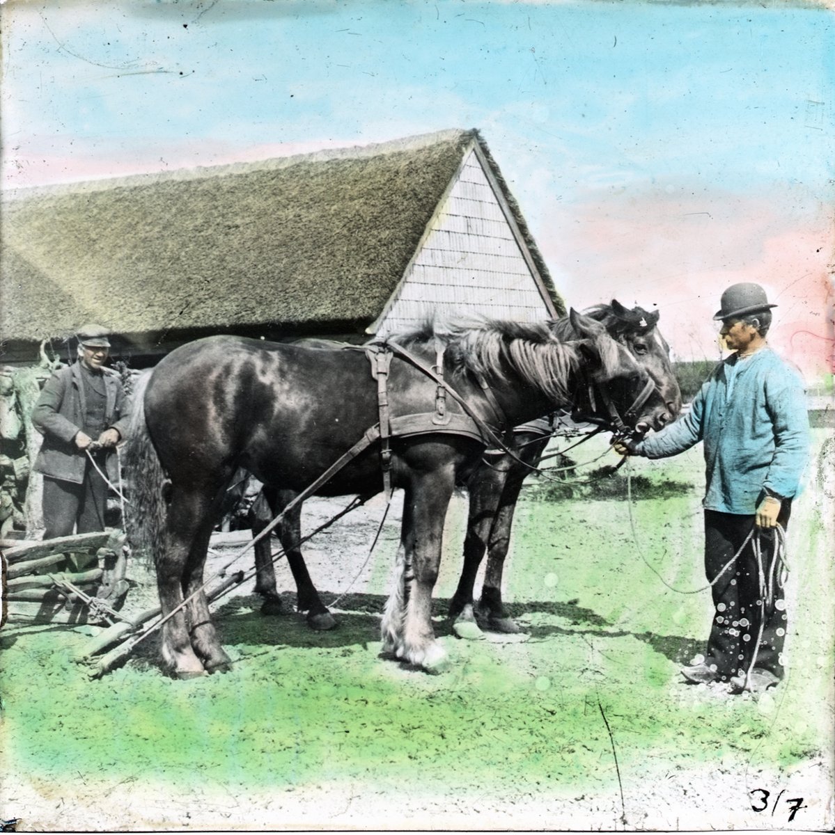 Man med två hästar, i bakgrunden hus med halmtak. Handkolorerad skioptikonbild