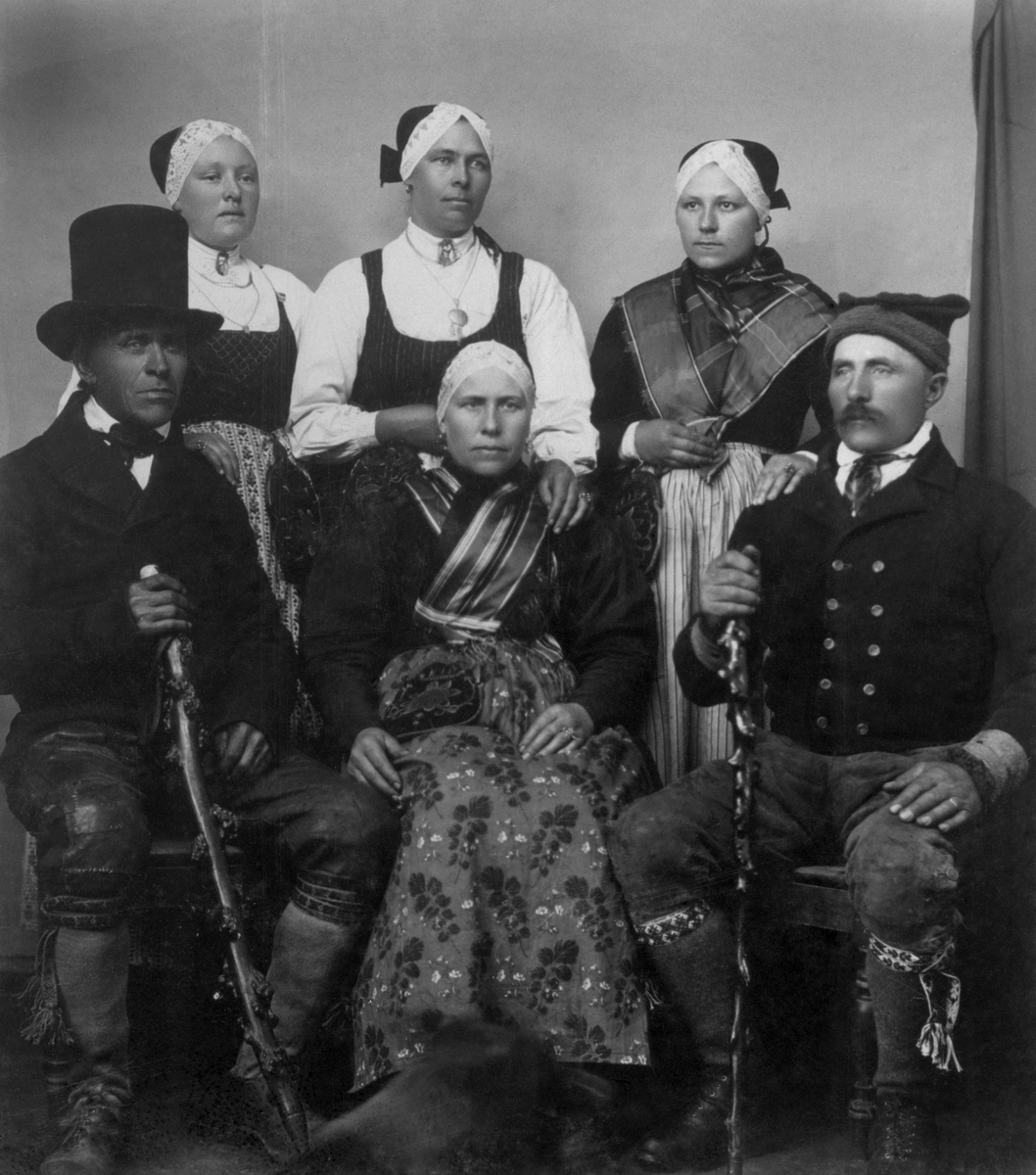En grupp män och kvinnor iklädda äldre folkdräkter från Härjedalen. Männen håller varsin käpp.