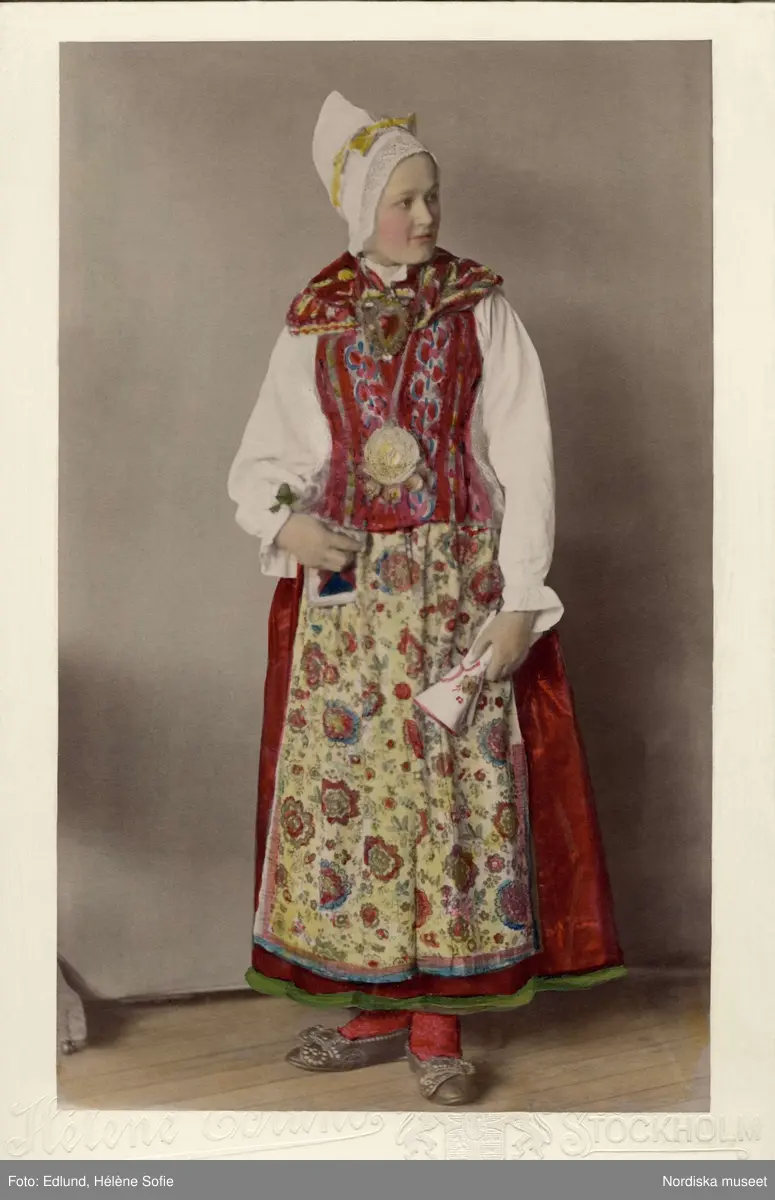 Sommarhögtidsdräkt så kallad ungmorsdräkt från Unnaryds socken i Småland för gift kvinna. Handkolorerat fotografi.