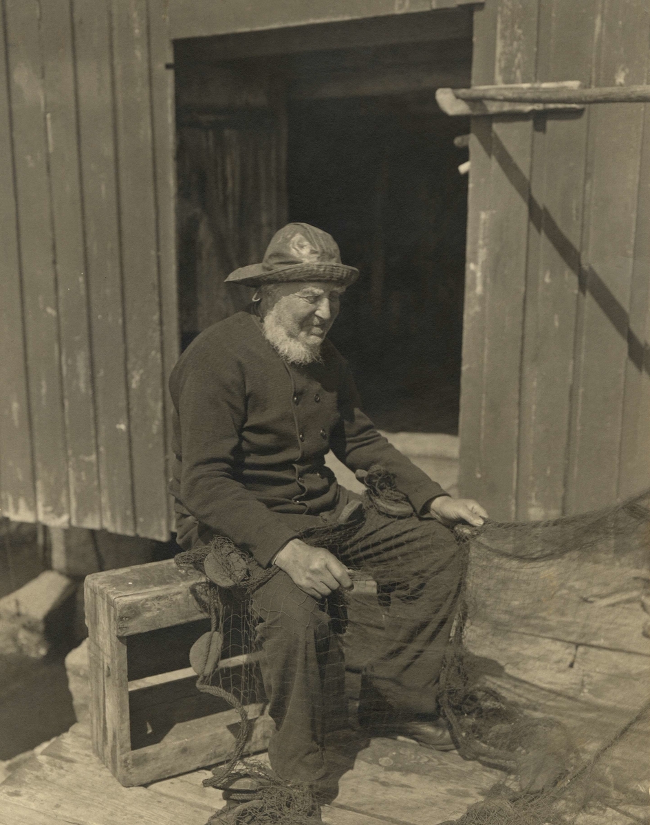 Titel: En gammal fiskare som sitter och lagar nät i Smögen Bohuslän