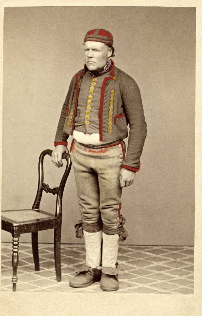 Sven Persson i norra Långsbo, annars Basken kallad. Bröllopsdräkt från Delsbo socken, Hälsingland.