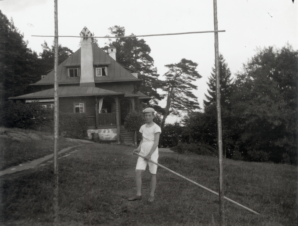 Pojke hållandes en höjdhoppsstav, stolpar och ribba bredvid. Villa i bakgrunden.