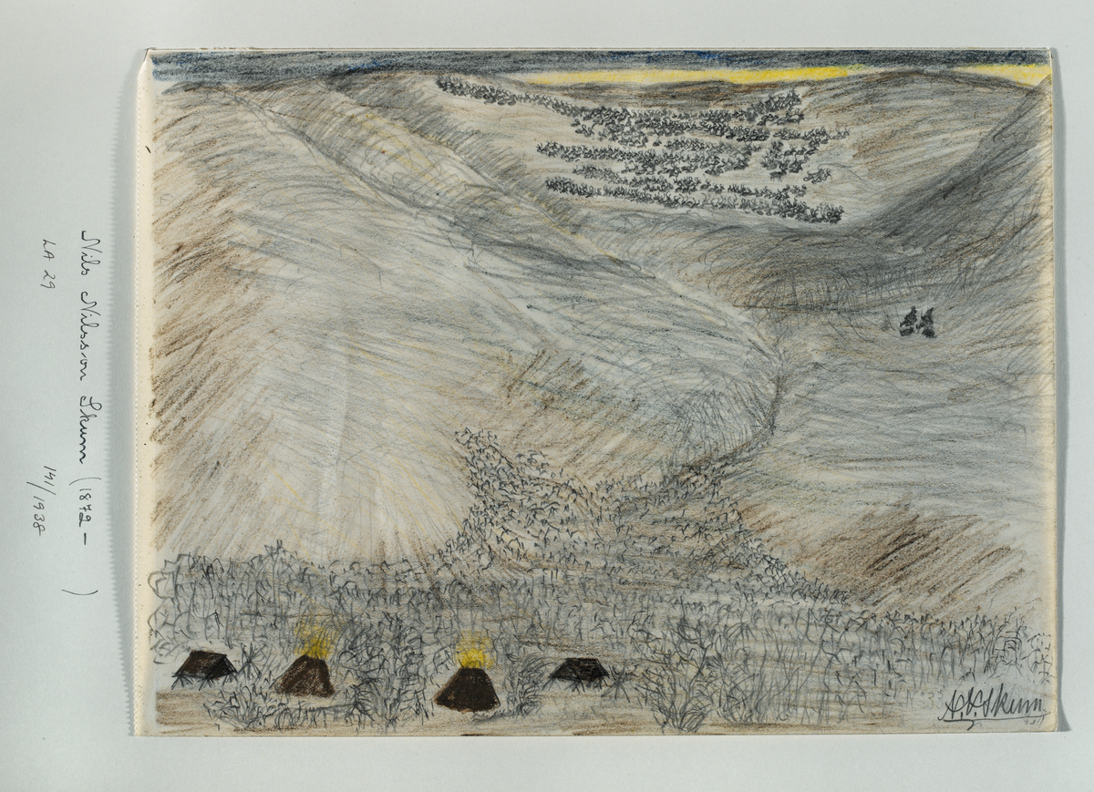Teckning av Nils Nilsson Skum, troligen utförd mellan 1930 och 1938. Kåtor och renhjord i fjällandskap.