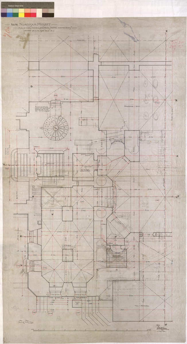 Ritning på väv över Nordiska museets huvudbyggnad. Plan av mittenpartiets jordvåning (främre vänstra delen) Omarbetad efter en den 30/9 1899 daterad ritningen. Plan. Jordvåning, mittenpartiet.126x71 cm. Tusch, blyerts och rött. Linjalritning. I Gust Clason 15 maj 1900. Fredrik Falkenberg.