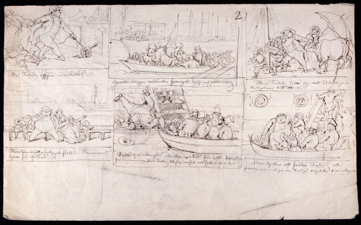 Serieteckning om familjen Tuting. Tuschteckning av Fritz von Dardel