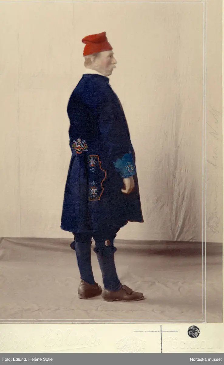 Man i helfigur i dräkt från Toarp, Västergötland. Röd mössa och blå, broderad rock. Handkolorerat fotografi