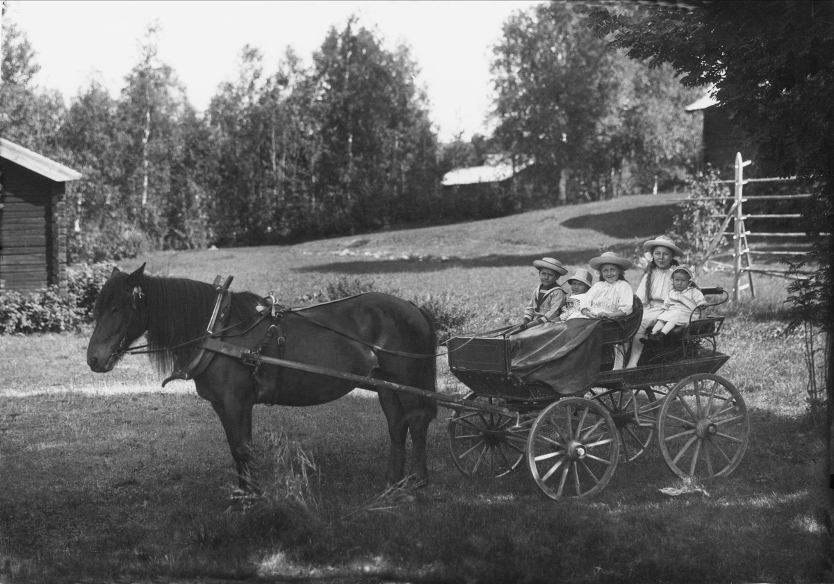 David Johansson och Ivan Johansson med kusinerna Doris, Gunhild och Asta Hollner i Ytternäs. Barnen sitter i en hästdragen vagn.
