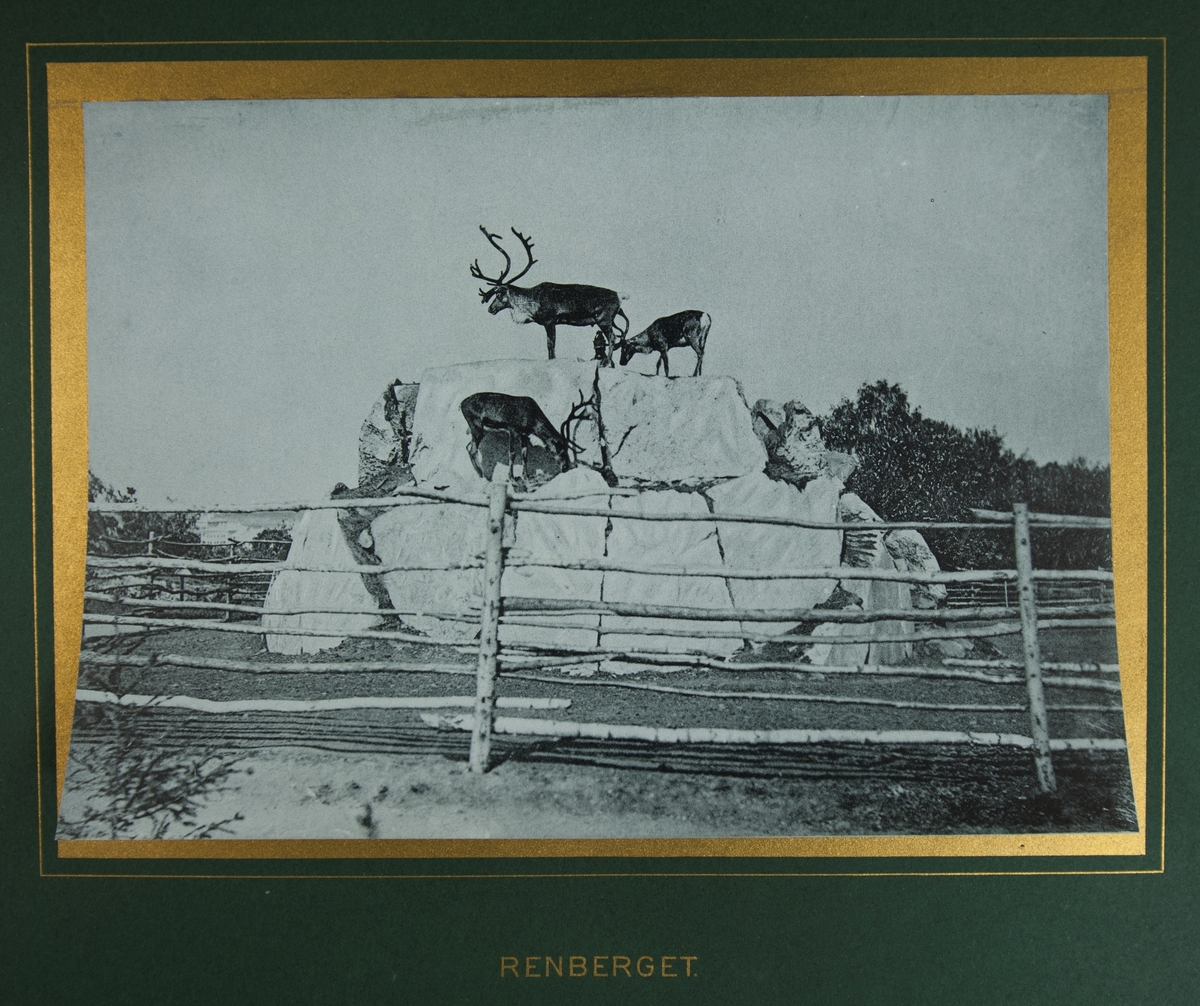 "Renberget" på Skansen. Renar i en hängnad står uppe på stenblock. L.A. 553. Bilden återfinns i A. Hazelius planschverk "Bilder från Skansen. Skildringar av svensk natur och svenskt folkliv" som utkom 1898.