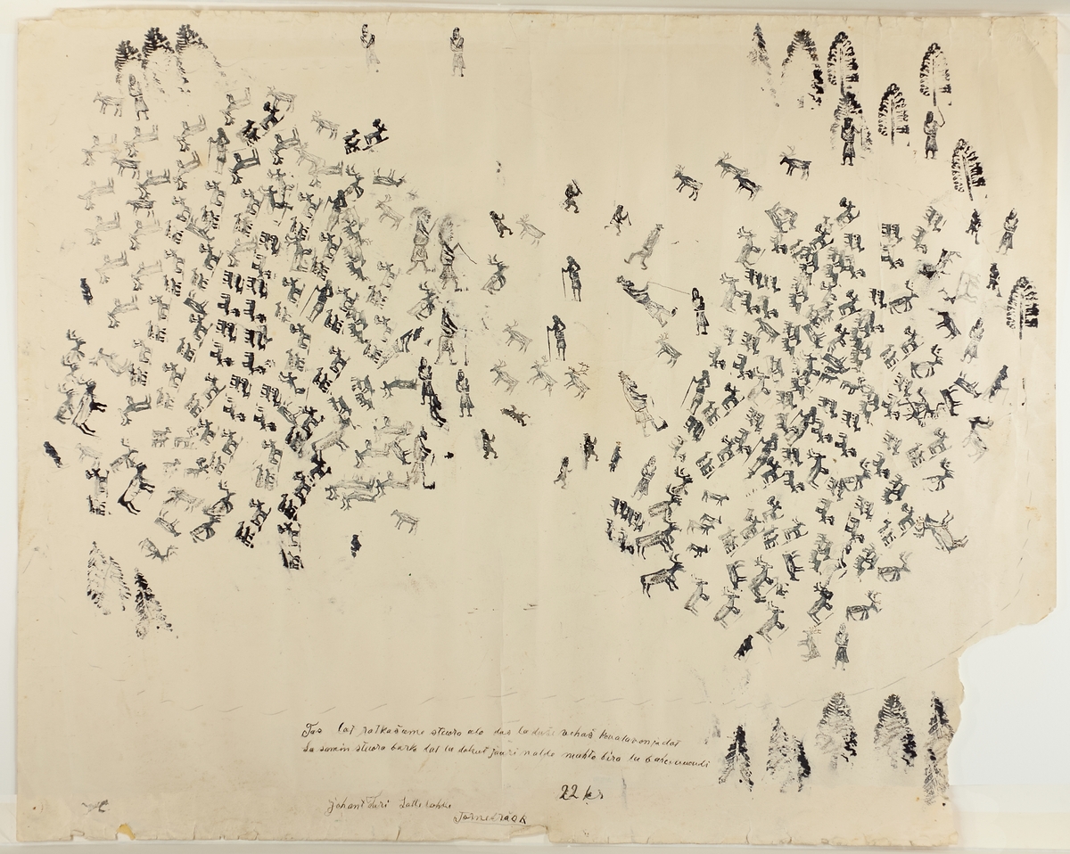 Teckning av Johan Turi. Renhjord och människor i arbete vid skogsbryn.