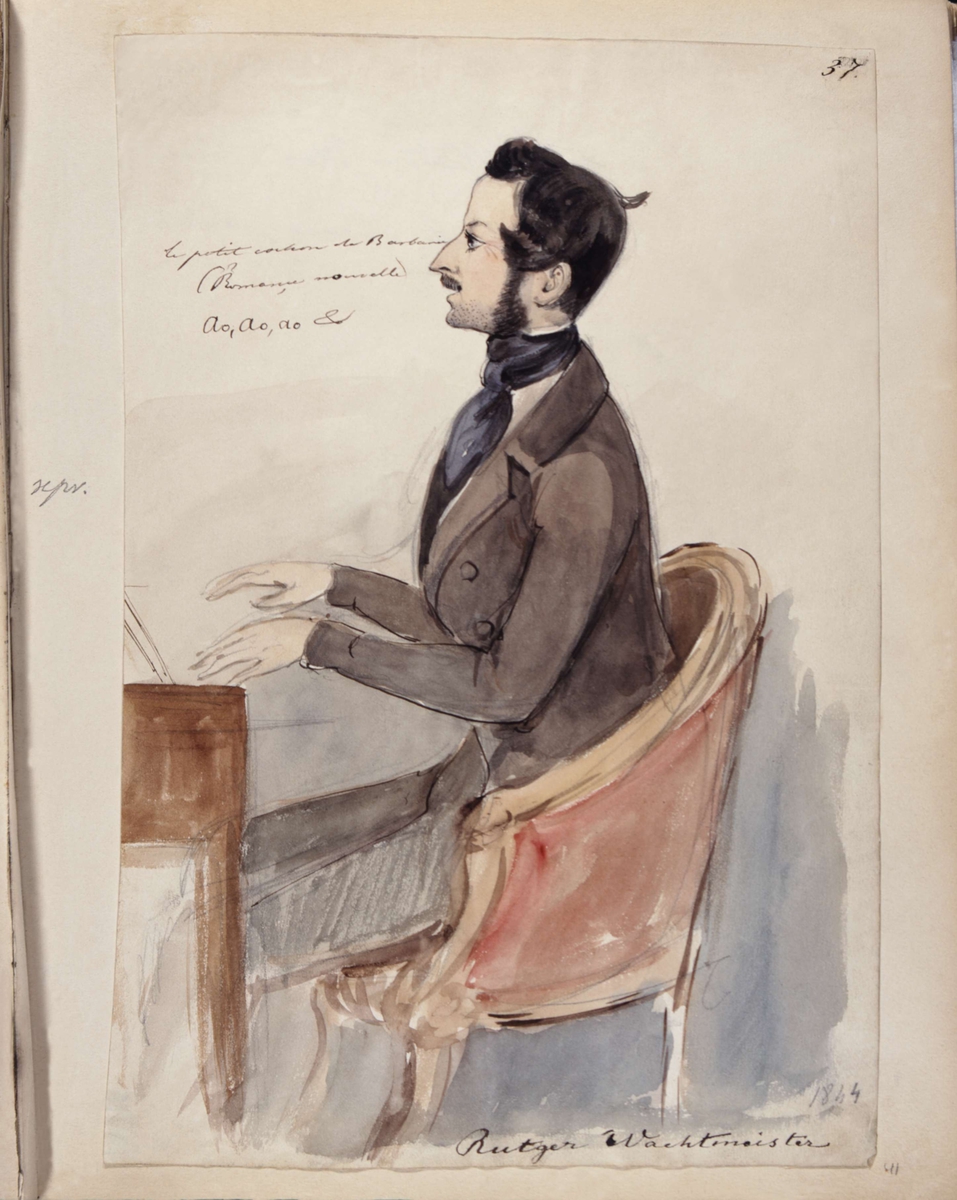 En man sitter och spelar på ett klaviaturinstrument". Akvarell av Fritz von Dardel, 1844