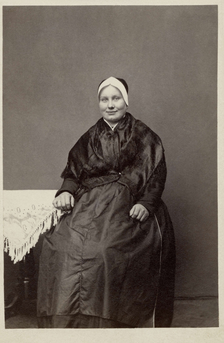 Kvinna sitter vid ett bord poserar i mörk dräkt, möjligen en svart sorgdräkt med det släta odekorerade stycket under bindmössan.