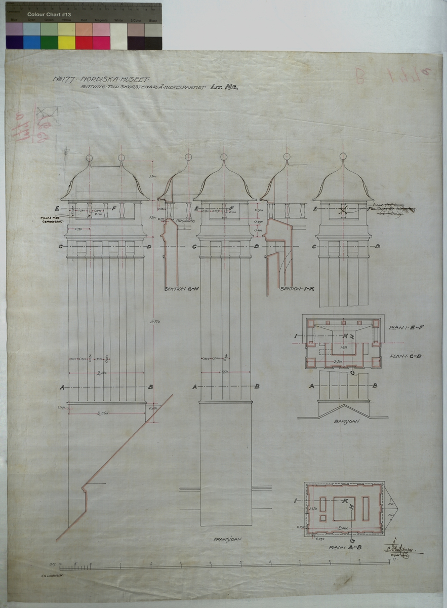 Ritning på väv över Nordiska museets huvudbyggnad. Ritning till
