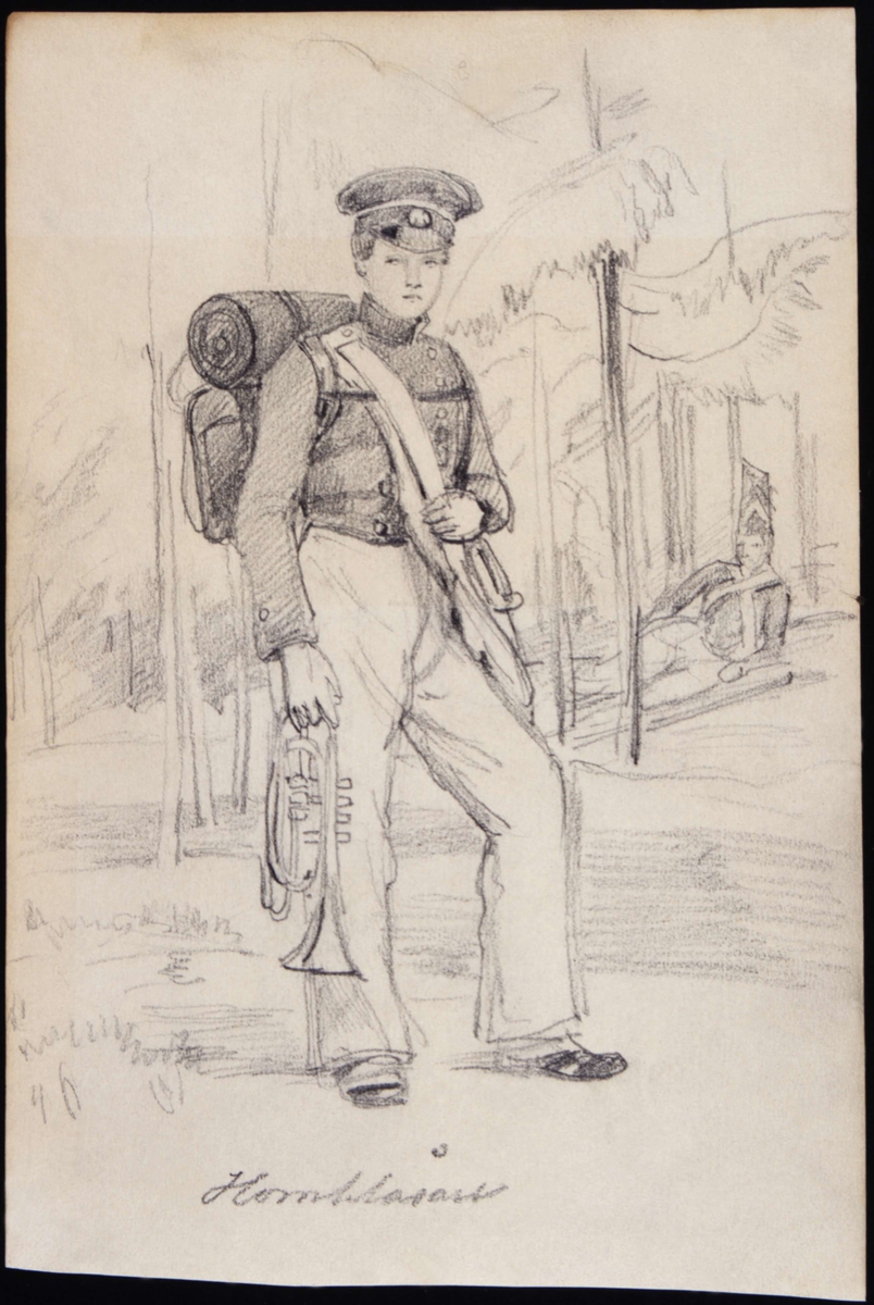 "Hornblåsare". Ung soldat med packning och instrument. Blyertsteckning av Fritz von Dardel.