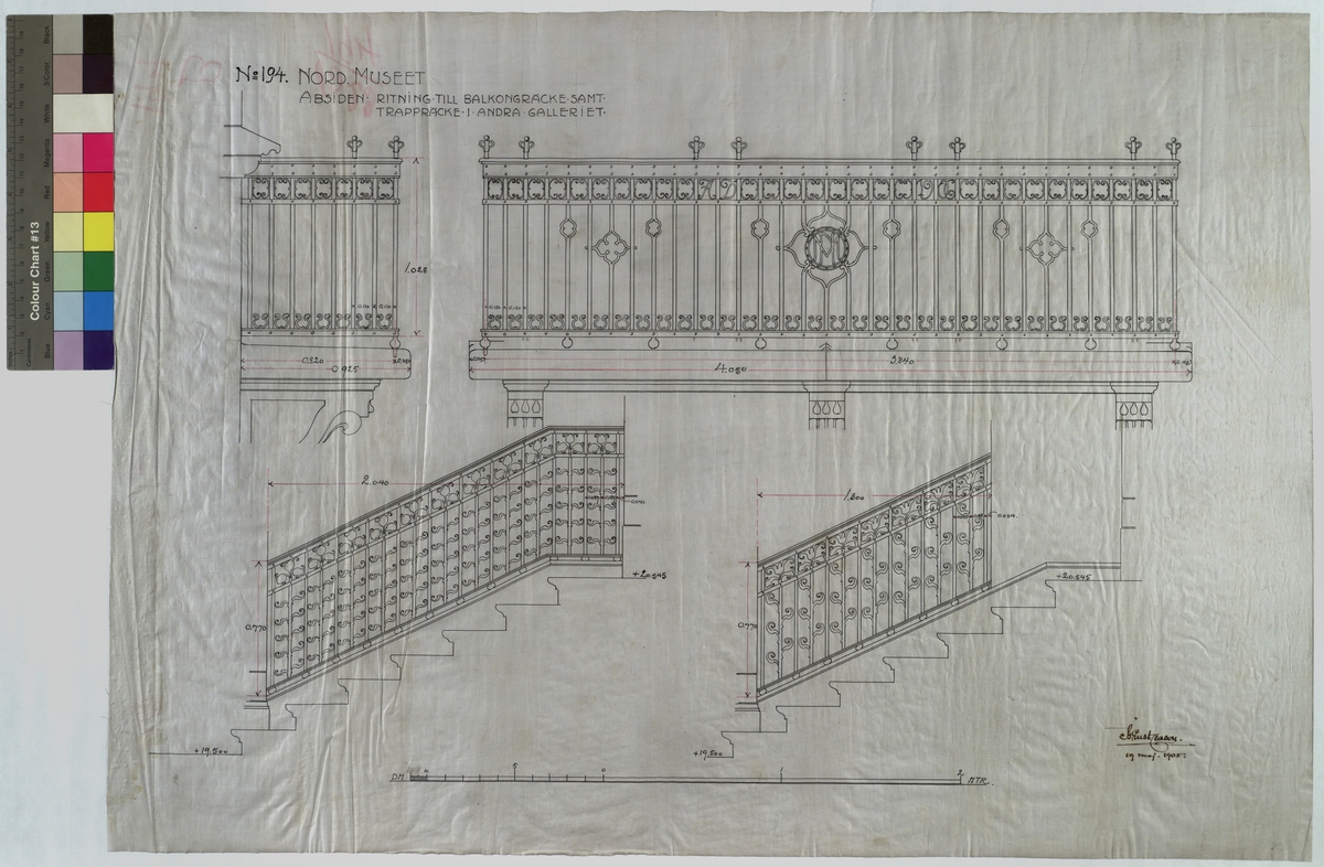 Ritning till balkongräcke samt trappräcke i andra galleriet. Fast inredning och elevation(?). Trappräcke och balkongräcke. 47,5x67,5 cm. Tusch och rött. I Gust Clason 19 maj 1905.