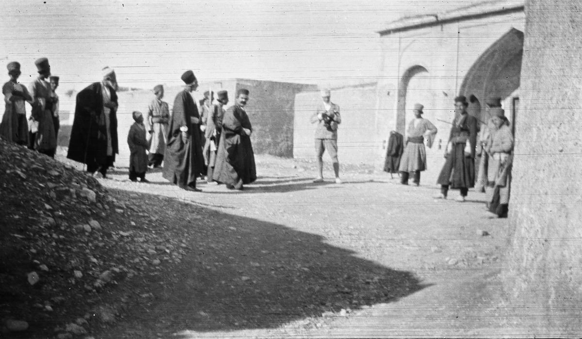 Persiska byinnevånare med svensk gendarmeriofficer i ljus huvudbonad (i mitten)