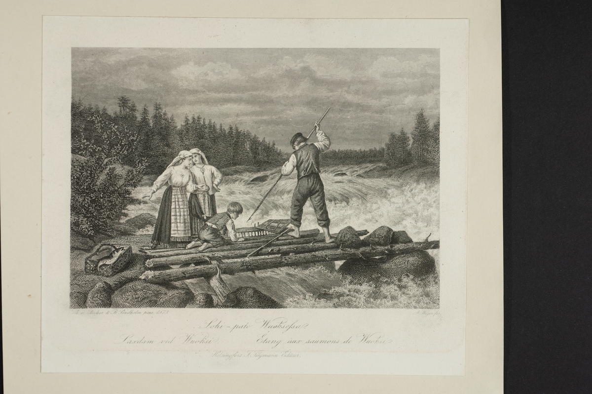 Ark med monterad bild och text: "Laxdam vid Wuoksi. A. v Becker & B. Lindholm pinx 1873."