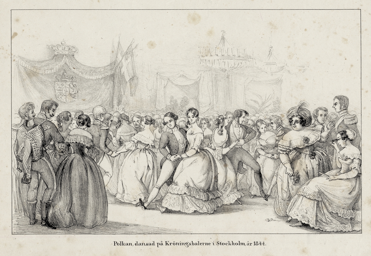 "Polkan, dansad på Kröningsbalerne i Stockholm år 1844". Teckning troligen gjord av Fritz von Dardel.