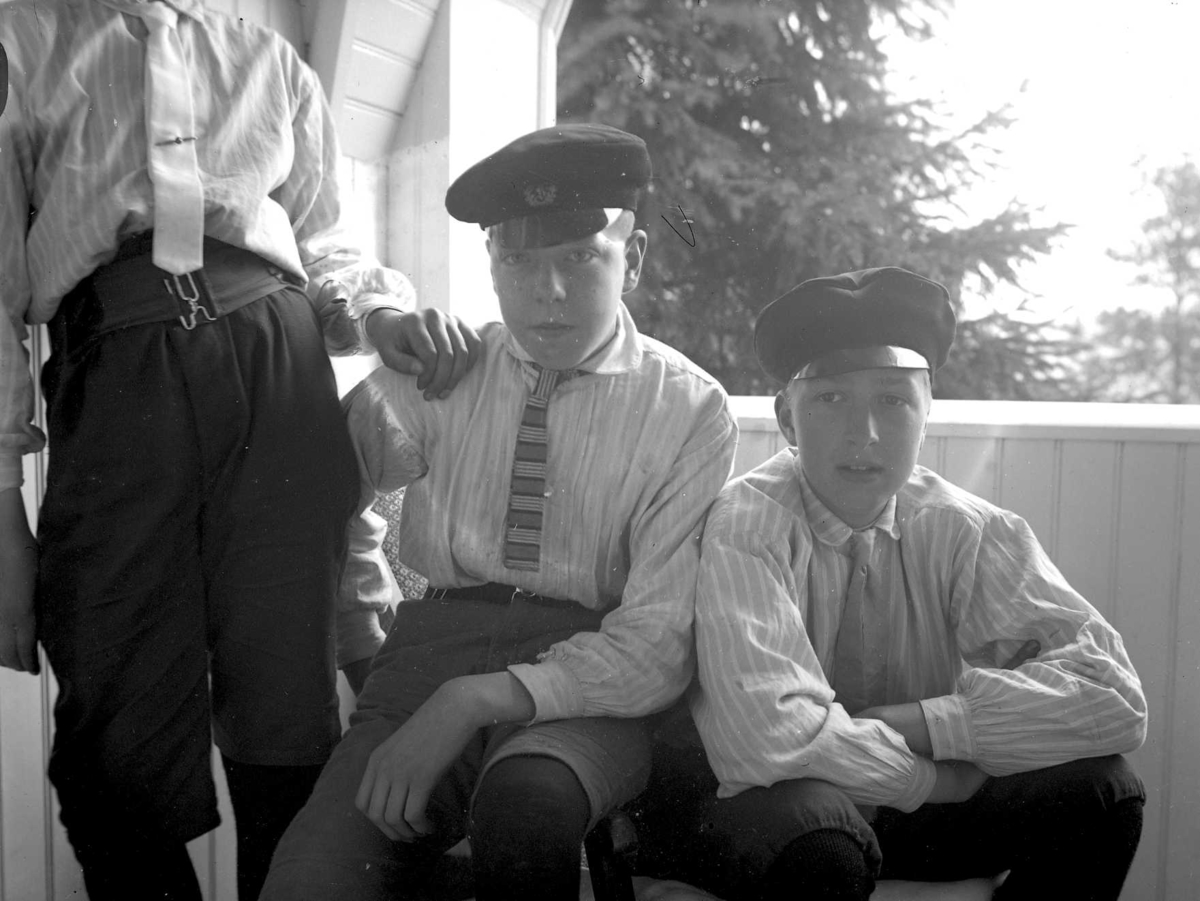 Tre pojkar med skärmmössor, knäbyxor, skjorta,och slips sitter på en balkong.