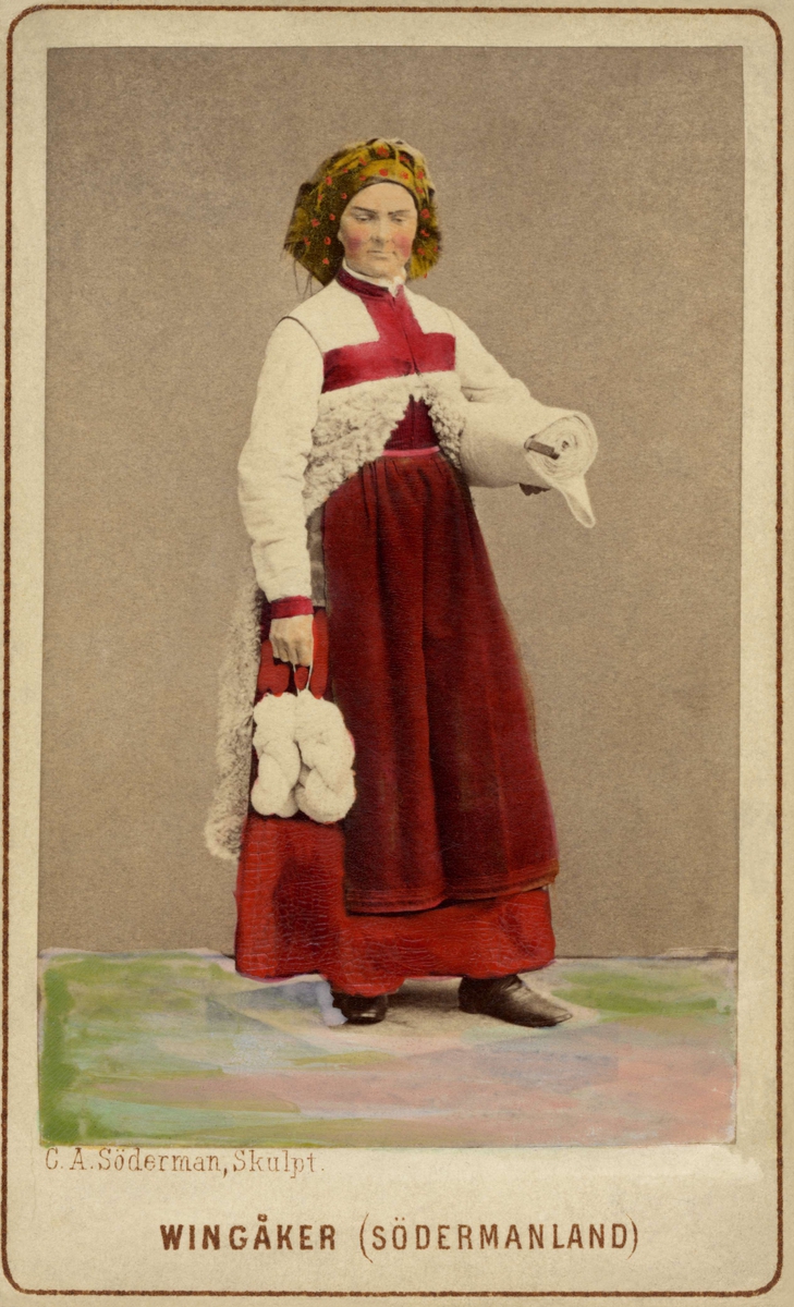 Kvinna i sockendräkt från Vingåker, Södermanland. Dräktdocka med huvud skulpterat av C A Söderman, visad på världsutställningen i Wien 1873. Handkolorerat fotografi.