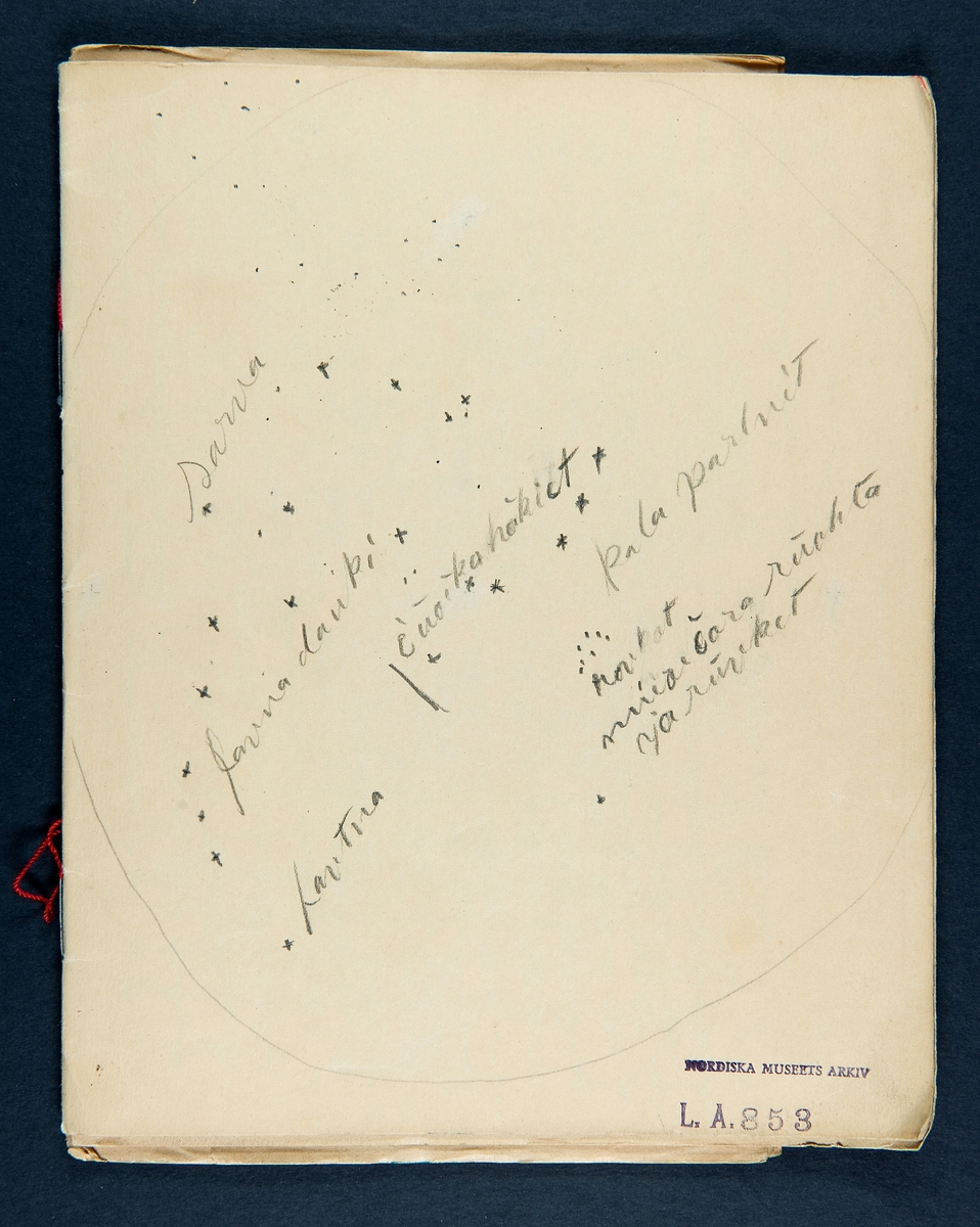 Fotografi av sida ur manus/ritbok (blått häfte) av Johan Turi. Sid. 1.