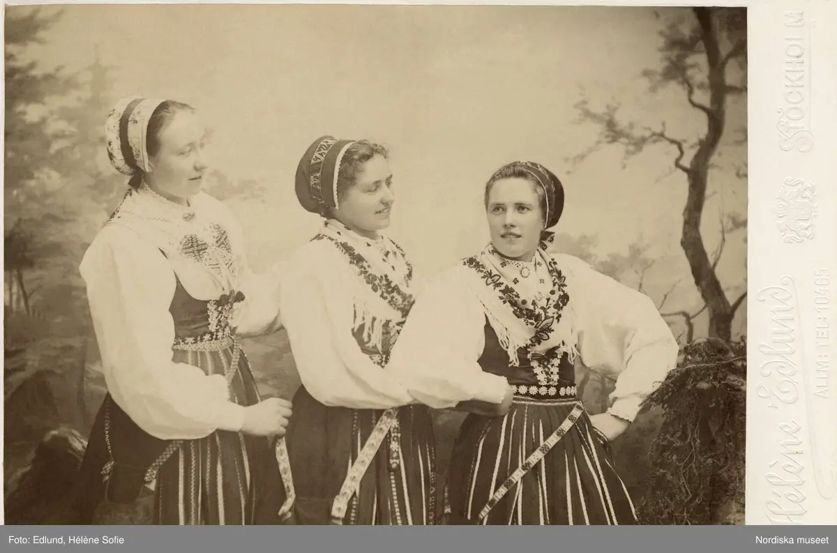 Tre unga kvinnor klädda i dräkter från Leksand, Dalarna.
