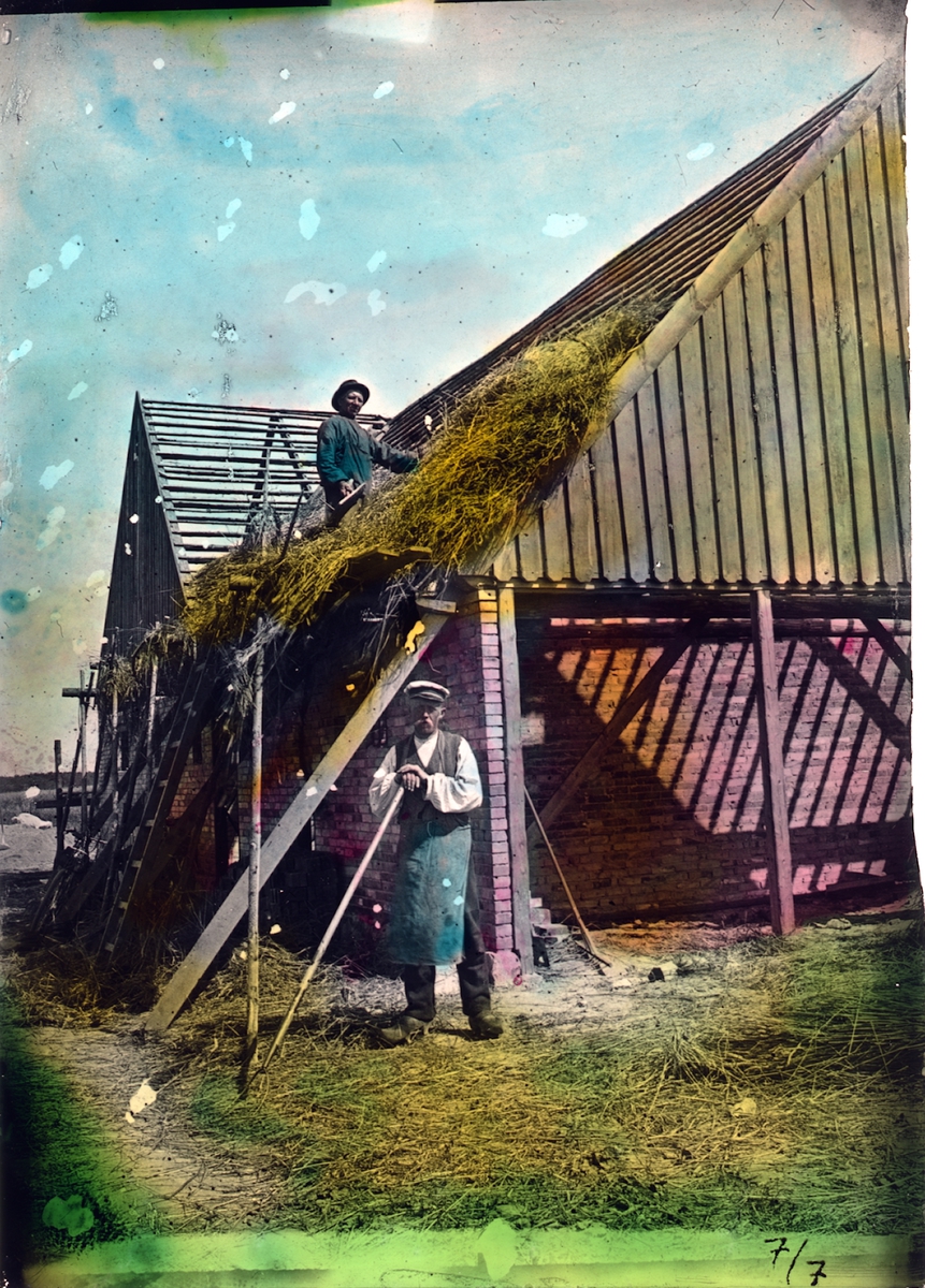 Två män, taktäckare, lägger ett halmtak. Handkolorerad skioptikonbild.