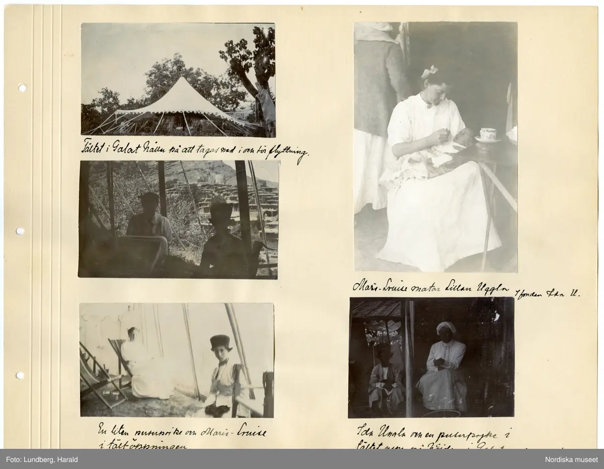 Sida ur fotoalbum med bilder från Harald Lundbergs vistelse i Persien. "Tältet i Galat håller på att tagas ned i och för flyttning." "En liten perserpojke och Marie-Louise i tältöppningen." "Marie-Louise matar lillan Uggla. I fonden Ida Uggla." "Ida Uggla och en perserpojke i tältet uppe på höjden i Galat."