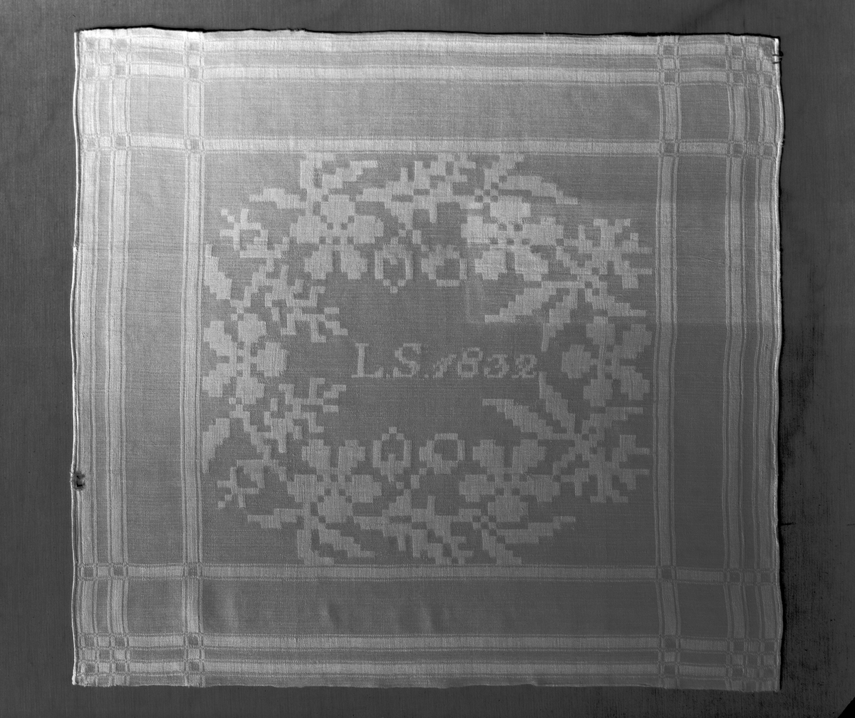 Servett med mönster hämtat ur Afhandling om drällers och dubbla golfmattors tillverkning, med begagnande af harnesk-rustning / författad af J.E. Ekenmark och systrar, Stockholm, 1928. Johan Erik (1786-1833), Hedda Christina ( 1786-1833), Lovisa Maria (1795-) och Gustava Fredrika, gift Beckvall (1800-). Linnedamast, invävt LS 1832, vävt av Björkanders linneväveri i Visby, Gotland. I privat ägo.