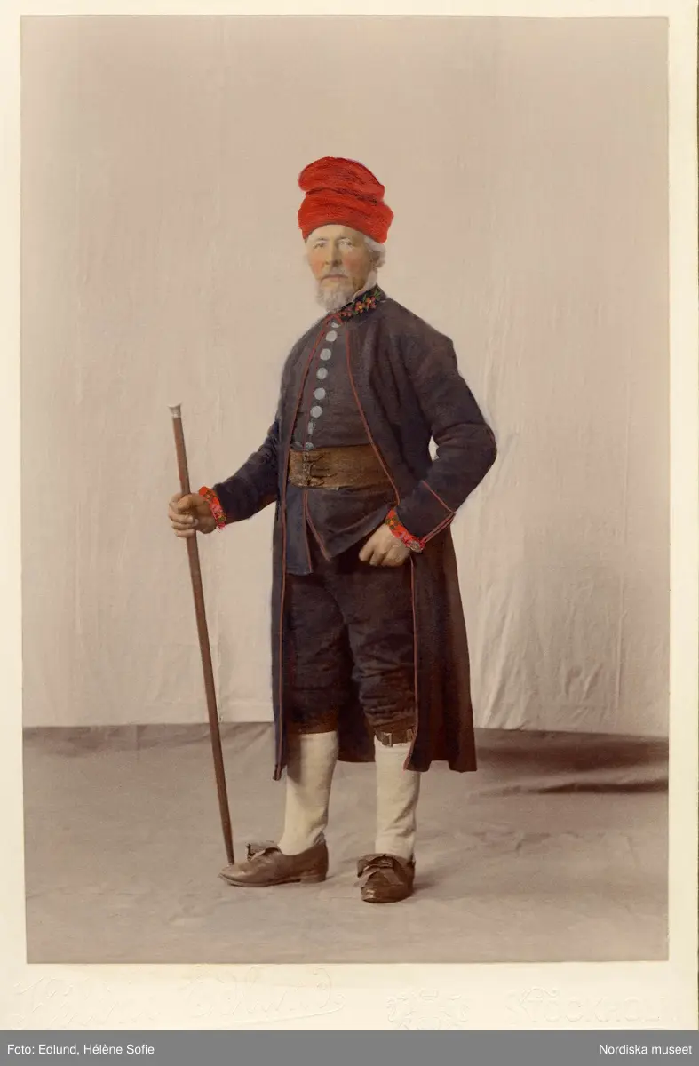 Man i helfigur klädd i kyrkdräkt från Järvsö socken, Hälsingland. Handkolorerat fotografi.