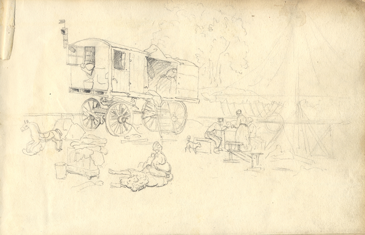 Blyertsskiss. Sällskap med stort (cirkus?)tält som byggs och tillhörande vagnar på ett fält. Ur Skissbok av A. J.G. Virgin