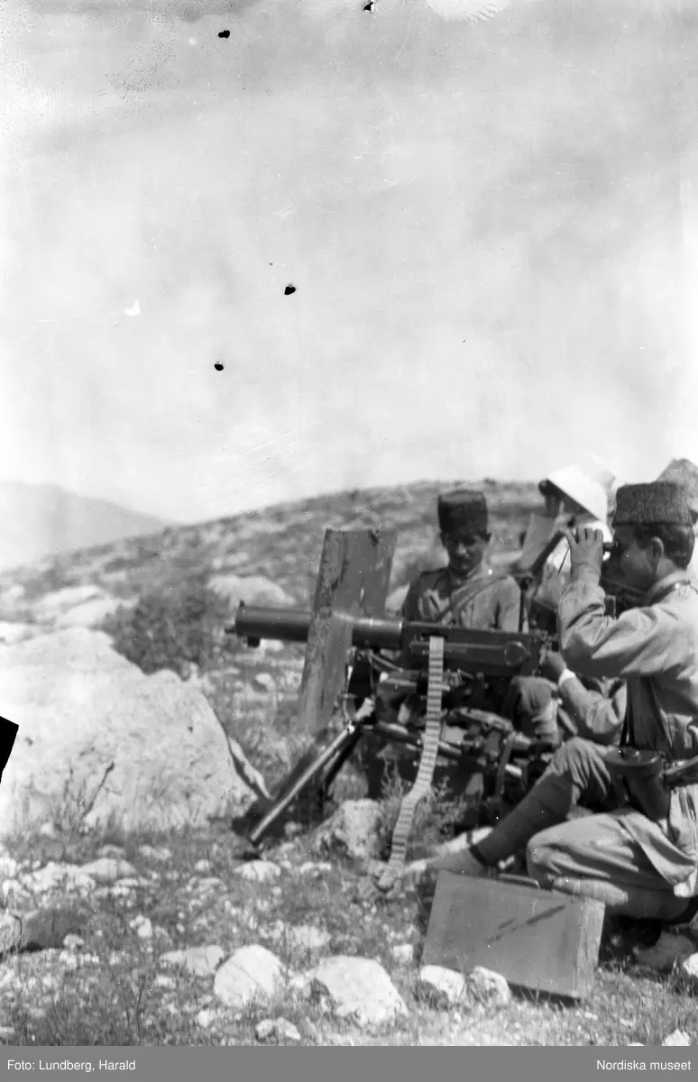Persiska gendarmer skjuter med en kulspruta vid en uppvisning utanför Bagh-e-Shah, Teheran.