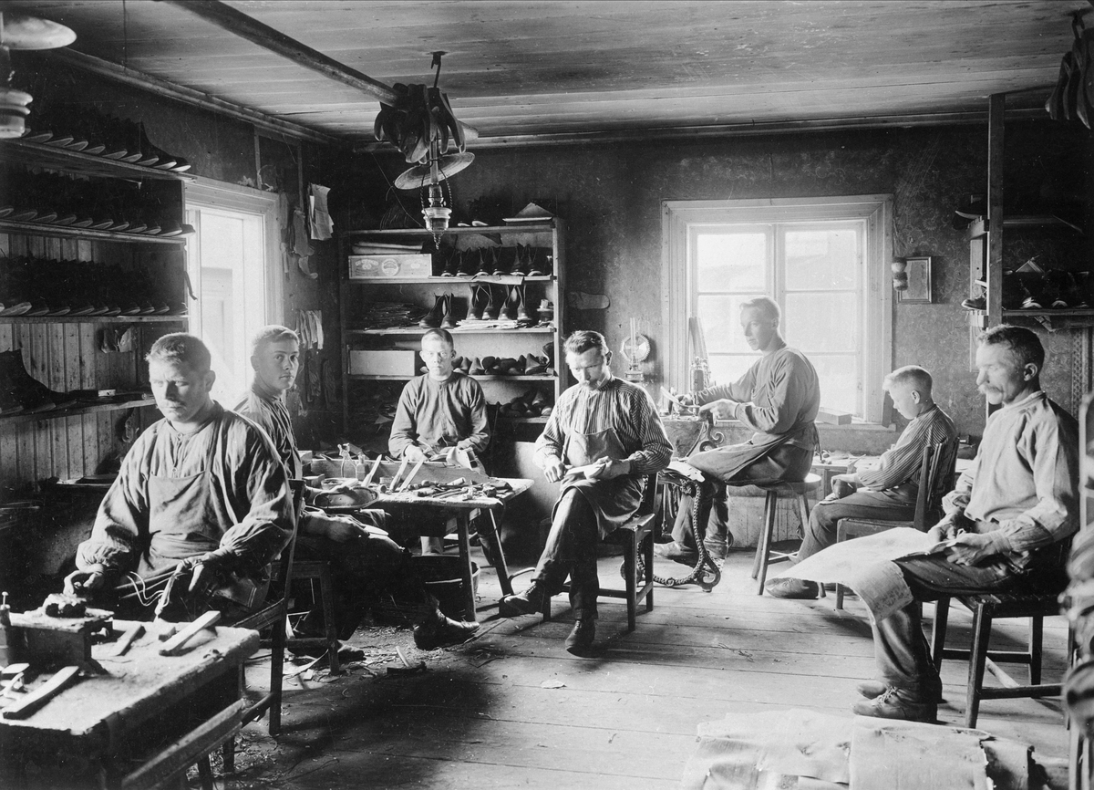 Ett antal skomakare, barn och vuxna, arbetar i verkstad.