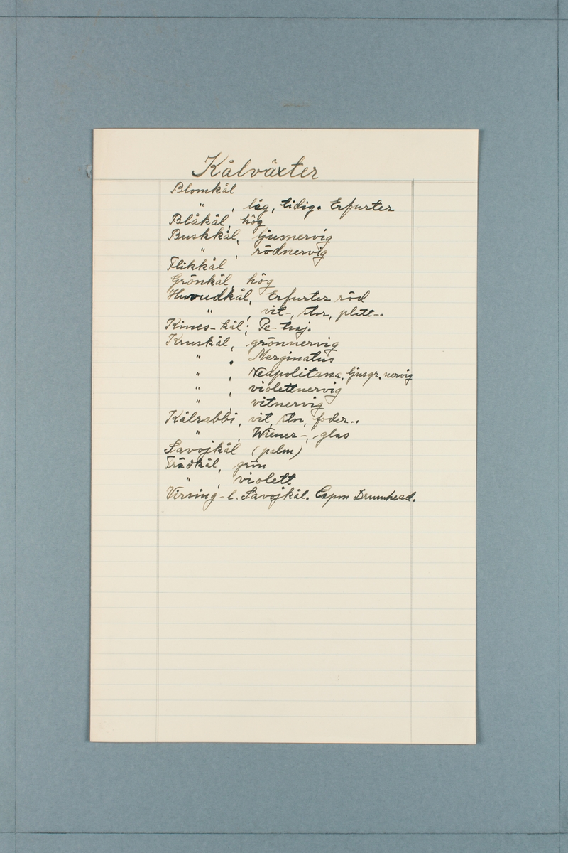 Sveriges kulturväxter. Lista över olika kålsorter med anknytning till illustrationer utförda av Henriette Sjöberg. Se även NMA.0098081 och NMA.0098082.