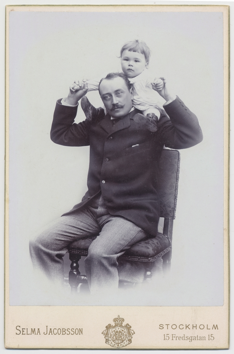 Porträtt föreställande markis Claes Lagergren med äldste sonen Claes sittande på sina axlar.