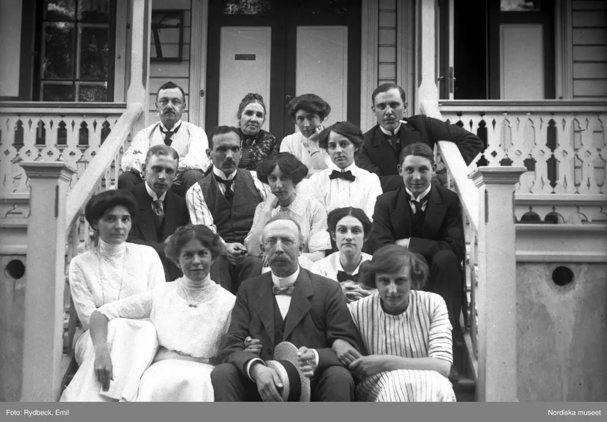 Gruppbild. Trappgrupp i Anneberg. Oscar R, Augusta Olson, Signe R, Waldemar P, Birger Personne, Gösta Olson, Gertrud, Anna Rydbeck och Erik Sohlman, Ingeborg Olson, Karin Palmgren, Fredrik, Sigrid och Carin Rydbeck.