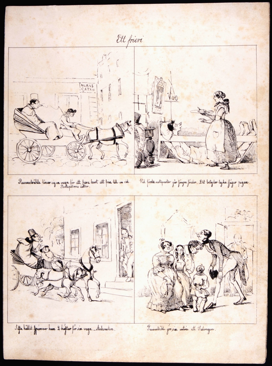 "Ett frieri". Pauverstråhle lånar sig en vagn för att fara bort att fria till en rik brukspatrons dotter. Tusch av Fritz von Dardel