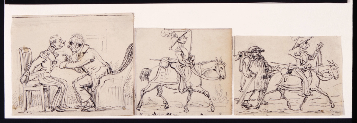 Ur "Sparfs äfventyr". Unge Sparf får goda råd av sin far och rider därefter iväg. Tusch av Fritz von Dardel, 1840