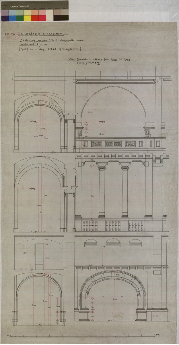 Ritning på väv över Nordiska museets huvudbyggnad. Skärning genom Utställningsgallerierna sedd mot Hallen. [G-H se ritning No 20 översiktsplan.) Sektion. Hallvåning, 1:a galleriet, 2:a galleriet.98x 53,5 cm.Tusch,rött. Linjalritning. Fri hand. Osignerad.
