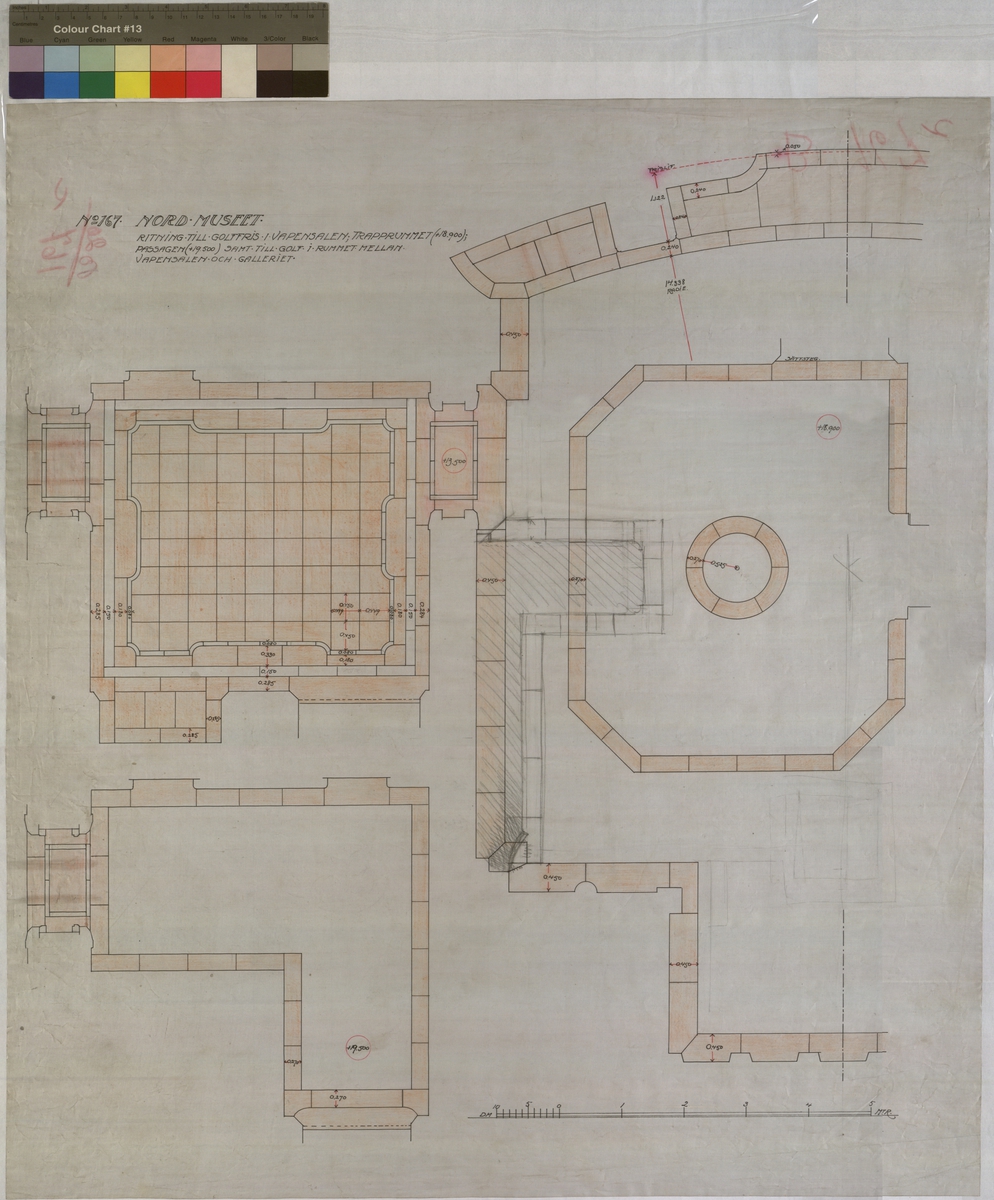Ritning på väv över Nordiska museets huvudbyggnad. Ritning till golvfris i vapensalen; trapprummet, passagen samt till golv i rummet mellan vapensalen och galleriet. Plan. Golv, kröningsläktaren. Tusch, rött, blyerts och brun krita. Linjalritning. Osignerad.