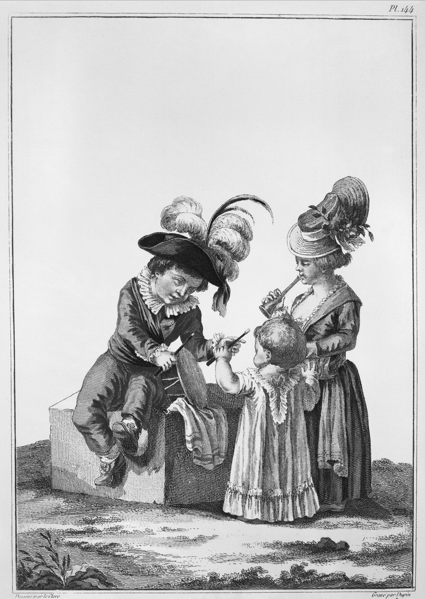 "Rousseau ivrade starkt för barnens rätt till bekväma kläder. För de mindre barnen föreslog han en ledig kolt, som lämnade fritt spelrum för deras rörelser. Publikationen Galerie des modes et Costumes Francais visade stort intresse för detta nytänkande, och på denna plansch från omkring 1780 ser vi dess version av kolten."