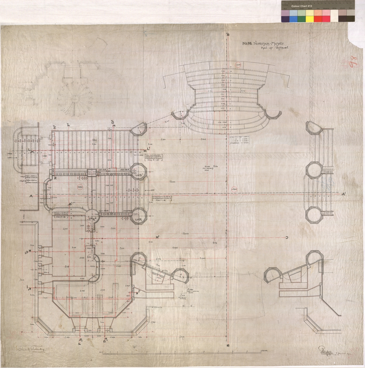 Ritning på väv över Nordiska museets huvudbyggnad. Plan av vestibulen. Plan. Vestibulen. 94x100 cm. Tusch med rött, brunt och grått. Linjalritning. I Gust Clason 7 januari 1901. Fredrik Falkenberg.